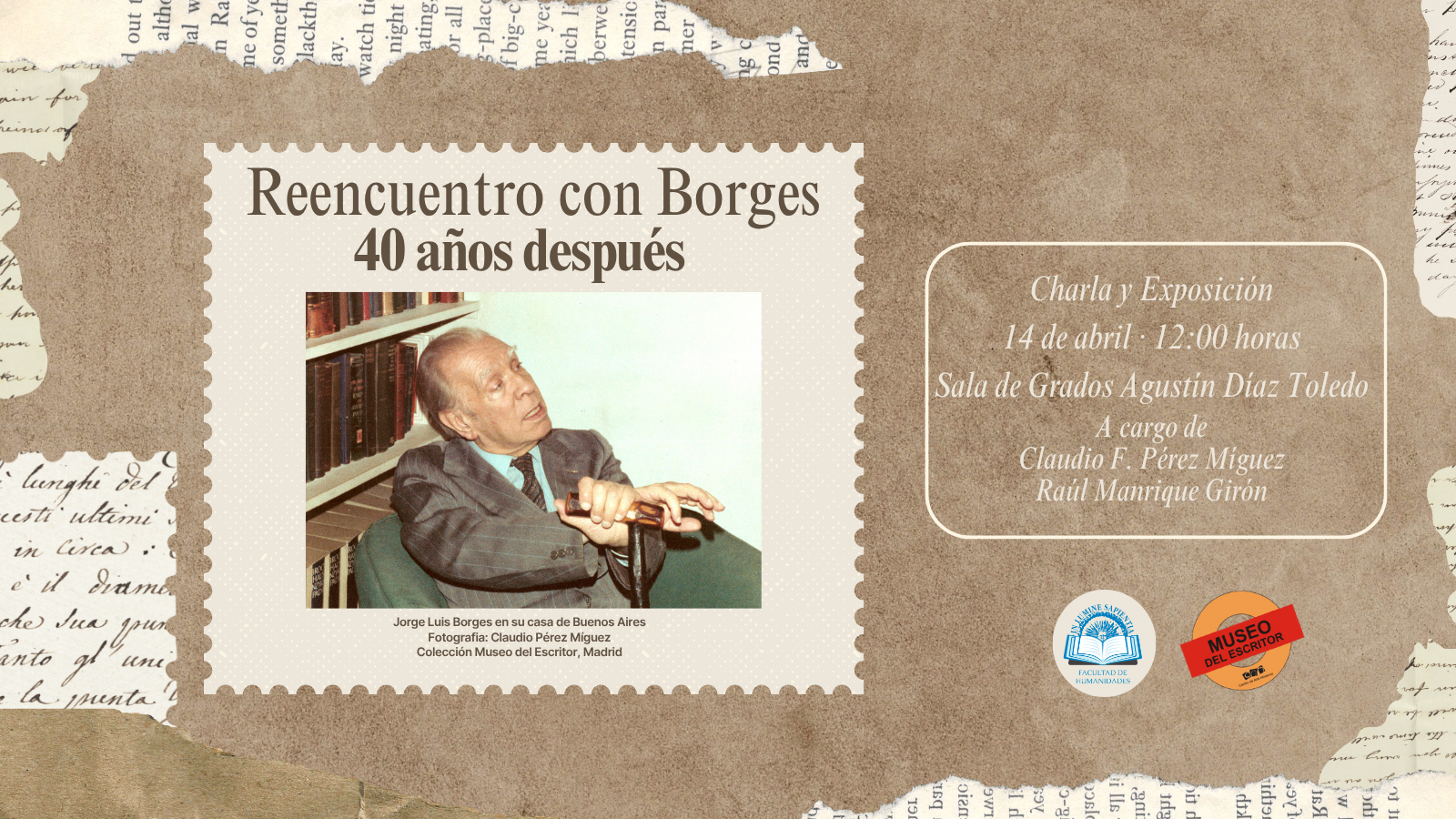 La Facultad de Humanidades y el Museo del Escritor presentan la charla y exposición "Reencuentro con Borges". La charla se llevará a cabo el próximo 14 de abril a las 12:00 horas en la Sala de Grados Agustín Díaz Toledo y continuará con la presentación de la exposición en el Hall de la Facultad de Humanidades (Edificio C).